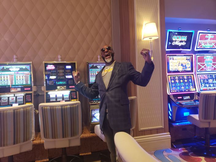 JFK celebrating with a student after just hitting a jackpot in the high limit room in Bellagio Las Vegas.